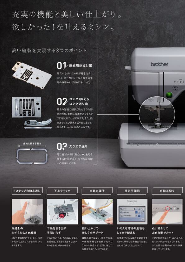 押えと送り歯が通常よりも長くなり、押えに関しては入りの部分が滑らかになり段差もラクラクに超えます。送りの機構がスクエア送りとなっており、通常よりも生地への接地時間が長くなりしっかりと生地を運びます。