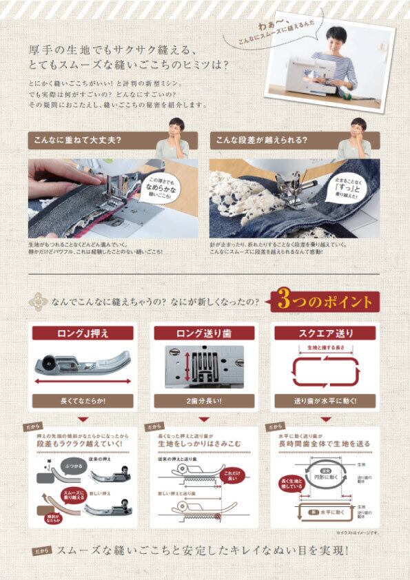 押えと送り歯が通常よりも長くなり、押えに関しては入りの部分が滑らかになり段差もラクラクに超えます。送りの機構がスクエア送りとなっており、通常よりも生地への接地時間が長くなりしっかりと生地を運びます。