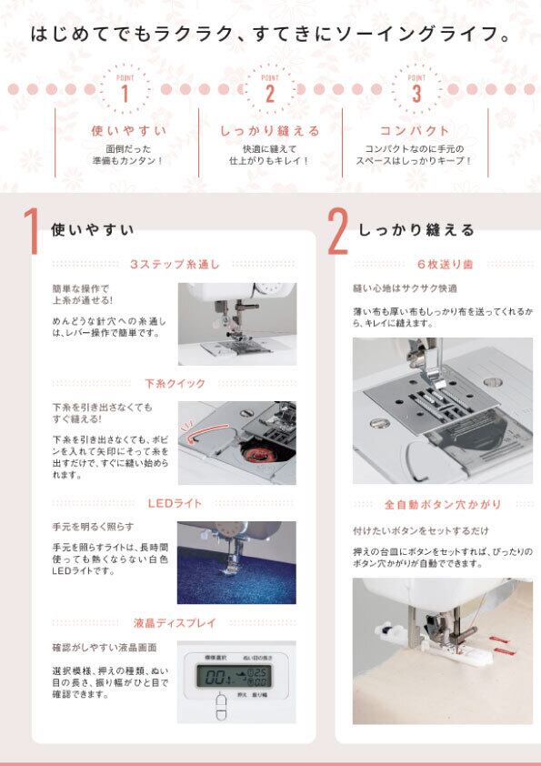 軽量で持ち運びも軽く、コンパクトなので収納場所も確保しやすい。設計がとてもシンプルで難しい操作に悩むことがなく、初心者の方にオススメのミシン。