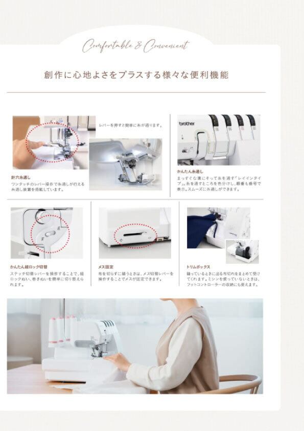 ステッチ切替レバーを操作することで、簡単に細ロックと巻き縫いを切り替えることが出来ます。